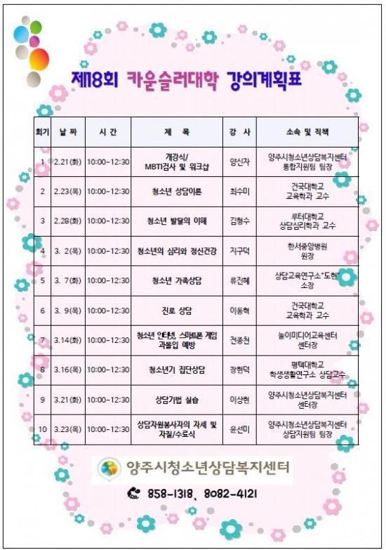 ±³À°Àº ¿À´Â 2¿ù 21ÀϺÎÅÍ 3¿ù 23ÀϱîÁö ¸ÅÁÖ È¿äÀϰú ¸ñ¿äÀÏ ¿ÀÀü 10½ÃºÎÅÍ 12½Ã 30ºÐ±îÁö ÃÑ 10ȸ¿¡ °ÉÃÄ ¾çÁÖû¼Ò³â¹®ÈÀÇÁý ´Ù¸ñÀû½Ç¿¡¼ ÁøÇàµÇ¸ç, û¼Ò³â»ó´ã Àü¹®°¡ µî ÇØ´ç ºÐ¾ß Àü¹®°¡°¡ °»ç·Î Âü¿©ÇÑ´Ù.