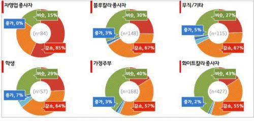 ¼Òµæ°¨¼Ò¿Í ´õºÒ¾î ÁöÃâµµ °¨¼ÒµÆ´Ù. °¡°èÁöÃâ º¯È¸¦ ¹¯´Â Áú¹®¿¡ 51%°¡ ÀÌÀüº¸´Ù °¨¼ÒÇß´Ù°í ÀÀ´äÇßÀ¸¸ç, ÀÚ¿µ¾÷ÀÚ(58%), ºí·çÄ®¶ó(53%), ÈÀÌÆ®Ä®¶ó(52%) µî ´ëºÎºÐ Á÷¾÷±º¿¡¼ ÁöÃâÀÌ ÁÙ¾îµç °ÍÀ¸·Î È®ÀεƴÙ.