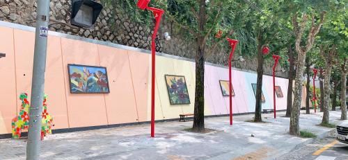 °ø°øµðÀÚÀÎÀÌ Àû¿ëµÈ ¿Ëº®ÀÇ ±æÀÌ´Â ¾à 100m, °íǰ°Ý µðÀÚÀÎ »ö»ó¿¡ ±×¸²Å¸ÀÏÀÌ º®¸éÀ» Àå½ÄÇÏ¸é¼ °íǰ°Ý ´ãÀå °¶·¯¸®·Î »õ·ÎÀÌ Åº»ýÇß´Ù.