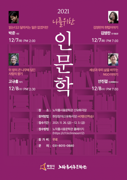 7ÀÏ¿¡´Â ¡®ÀÐ´Â´Ù°í ´Þ¶óÁö´Â ÀÏÀº ¾ø°ÚÁö¸¸(¹ÚÁØ ½ÃÀÎ)¡¯°ú ¡®±è¿µ¶õÀÇ Çå¹ýÀ̾߱â(±è¿µ¶õ Àü ´ë¹ý°ü)¡¯°¡ Ư°À¸·Î ÁøÇàµÇ¸ç 8ÀÏ¿¡´Â ¡®ÀÌ ¶¥ÀÇ Å« ³ª¹«¿¡ ´ã±ä »ç¶÷ÀÇ Çâ±â(°í±ÔÈ« ÀÛ°¡)¡¯¿Í ¡®¼¼»ó°ú ¿ì¸® »îÀ» ¹Ù²Ù´Â NGOÀ̾߱â(¾ÈÁø°É ¹Î»ýÄ·ÆäÀ̳Ê)¡¯°¡ ÁøÇàµÈ´Ù.