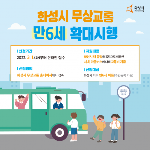 ¸¸ 6¼¼ ¾Æµ¿ÀÌ ÀÖ´Ù¸é, 3¿ù 1ÀϺÎÅÍ È¼º½Ã ¹«»ó±³Åë ȨÆäÀÌÁö(https://savebus.hscity.go.kr) ¶Ç´Â ¸ð¹ÙÀÏ À¥À» ÅëÇØ ¹«»ó±³Åë Ä«µå¸¦ ½ÅûÇÒ ¼ö ÀÖ´Ù.