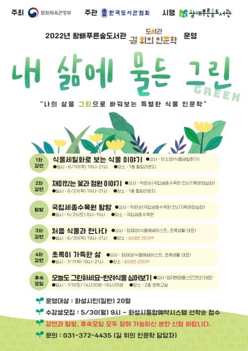 ¿Õ¹èǪ¸¥½£µµ¼°üÀº Æ¯È ÁÖÁ¦ÀÎ ¡®È¯°æ¡¯°ú ¿¬°èÇÏ¿© ¡®³» »î¿¡ ¹°µç ±×¸°(GREEN)¡¯À» ¿î¿µÇÑ´Ù. ½Ä¹° Àι®ÇÐ °ÁÂ¿Í Å½¹æ ¹× üÇèÀ¸·Î ±¸¼ºµÈ ÇÁ·Î±×·¥À» 6¿ù 16ÀϺÎÅÍ 7¿ù 9ÀϱîÁö ÃÑ 6Â÷½Ã·Î ÁøÇàÇÑ´Ù. °Á·Π¡â ½Ä¹°¼¼¹ÐÈ·Î º¸´Â ½Ä¹°À̾߱â(À̼ҿµ ½Ä¹°¼¼¹ÐȰ¡) ¡â Àç¹ÌÀÖ´Â ²É°ú Á¤¿øÀ̾߱â(¹Ú¿ø¼ø ±¹¸³¼¼Á¾¼ö¸ñ¿ø Àü½Ã±âȹ¿î¿µ½ÇÀå) ¡â óÀ½ ½Ä¹°°ú ¸¸³ª´Ù, ÃÊ·ÏÀÌ °¡µæÇÑ »î(Á¤Àç°æ ½Ä¹°¿¡¼¼À̽ºÆ®)À» ÁøÇàÇÑ´Ù. °¿¬ ÈÄ¿¡´Â ±¹¸³¼¼Á¾¼ö¸ñ¿øÀ¸·Î ޹æÀ» ¶°³ª, ½Ä¹°À» Á÷Á¢ ´«À¸·Î °¨»óÇϰí üÇèÇÏ´Â ½Ã°£À» °®´Â´Ù. ÈÄ¼Ó ¸ðÀÓ¿¡¼´Â ³ª¸¸ÀÇ ¹Ý·Á ½Ä¹°À» ½É¾îº¸´Â üÇèµµ ÁøÇàÇÑ´Ù. 5¿ù 30ÀϺÎÅÍ Âü¿©ÀÚ¸¦ ¸ðÁýÇÑ