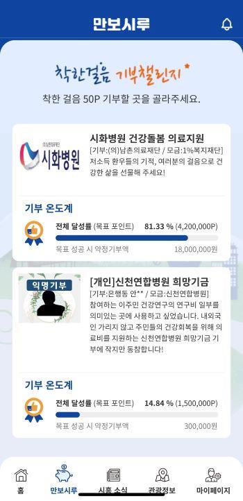 ¸¸º¸½Ã·ç ±âºÎ縰Áö´Â 1¸¸ °ÉÀ½ ÀÌ»óÀ» °ÉÀ¸¸é ½ÃÈï½Ã Áö¿ªÈÆóÀÎ ¸ð¹ÙÀÏ ½Ã·ç 100¿øÀÌ Àû¸³µÇ´Â ¡®¸¸º¸½Ã·ç¡¯ ¾Û(App)À» ÅëÇØ °ÉÀ½ ¼ö Æ÷ÀÎÆ®¸¦ ±âºÎÇÒ ¼ö ÀÖ´Â ±â´ÉÀÌ´Ù. ±âºÎ Âü¿©ÀÚÀÇ ¸ñÇ¥ °ÉÀ½ ¼ö°¡ ´Þ¼ºµÇ¸é ±â¾÷ µîÀÌ ¾àÁ¤ÇÑ ±Ý¾×À» ±âºÎ ¸ðÁý±â°ü(½ÃÈï½Ã1%º¹ÁöÀç´Ü, ½Åõ¿¬ÇÕº´¿ø)¿¡ Àü´ÞÇÏ°Ô µÈ´Ù.