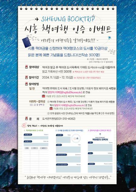 ¡®Ã¥ ¿©Çà ÀÎÁõ À̺¥Æ®¡¯ Âü¿©´Â ±â°£ ³»¿¡ Á¢¼öµÈ °Ç¿¡ ´ëÇØ¼¸¸ ÀÎÁ¤Çϸç, ±âŸ ÀÚ¼¼ÇÑ ³»¿ëÀº ½ÃÈï½Ã µµ¼°ü ´©¸®Áý(https://lib.siheung.go.kr)À» ÅëÇØ È®ÀÎÇÒ ¼ö ÀÖ´Ù. ±Ã±ÝÇÑ Á¡Àº ¼Ò·¡ºûµµ¼°ü(031-310-4082)À» ÅëÇØ ¹®ÀÇÇÏ¸é µÈ´Ù.