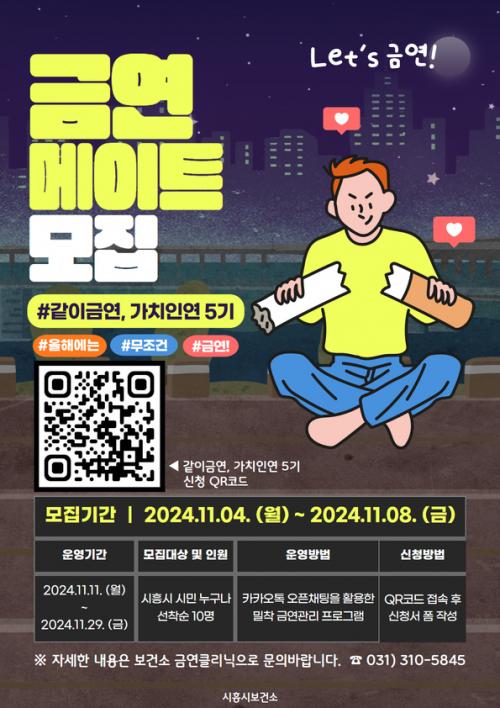 ¡®°°ÀÌ ±Ý¿¬, °¡Ä¡Àο¬¡¯Àº ±Ý¿¬ Ŭ¸®´Ð µî·Ï ÈÄ Á÷Àå»ýȰÀ̳ª °³ÀÎ ÀÏÁ¤ µîÀÇ ÀÌÀ¯·Î ±Ý¿¬ Ŭ¸®´ÐÀ» Áßµµ Æ÷±âÇÏ´Â »ç·Ê¸¦ ÁÙÀ̱â À§ÇØ, ºñ´ë¸é ¹æ½ÄÀ¸·Î ¿î¿µµÇ´Â ÇÁ·Î±×·¥ÀÌ´Ù. À̹ø 5±â ÇÁ·Î±×·¥Àº ¼±Âø¼øÀ¸·Î 10¸íÀ» ¸ðÁýÇϸç, Âü¿© Èñ¸ÁÀÚ´Â ½ÃÈï½Ã ±Ý¿¬ Ŭ¸®´Ð(031-310-5845)°ú È«º¸¹°ÀÇ Å¥¾Æ¸£(QR)Äڵ带 ÅëÇØ ½ÅûÇÒ ¼ö ÀÖ´Ù.