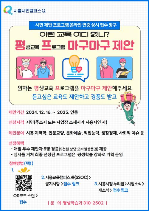 ¡®Æò»ýÇнÀ ÇÁ·Î±×·¥ ¸¶±¸¸¶±¸ Á¦¾È¡¯Àº 2024³â 12¿ù 16ÀϺÎÅÍ 2025³â ¿¬¸»±îÁö ÁøÇàµÇ¸ç, ½ÃÈï½Ã¿¡ ÁÖ¼Ò³ª »ç¾÷ÀåÀÌ ÀÖ´Â ½Ã¹ÎÀ̶ó¸é ´©±¸³ª Âü¿©ÇÒ ¼ö ÀÖ´Ù.