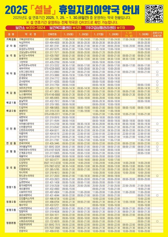 ¼³ ¸íÀý ¿¬ÈÞ ±â°£ Áß ºñ»óÁø·á¿¡ °üÇÑ ³»¿ë°ú Àα٠Áö¿ª ´çÁ÷ÀÇ·á±â°ü ¹× ÈÞÀÏ ÁöÅ´ÀÌ ¾à±¹ÀÇ ¿¬¶ôó µî ÀÚ¼¼ÇÑ »çÇ×Àº ÀÀ±ÞÀÇ·áÁ¤º¸¼¾ÅÍ ´©¸®Áý°ú ½ÃÈï½Ãû ´©¸®Áý, ½º¸¶Æ®Æù ¾Û(App) ¡®ÀÀ±ÞÀÇ·á Á¤º¸Á¦°ø¡¯ ¹× Å¥¾Æ¸£(QR) Äڵ带 ÅëÇØ È®ÀÎÇÒ ¼ö ÀÖ´Ù.