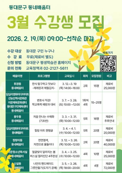 ¼ö°À» Èñ¸ÁÇÏ´Â ±¸¹ÎÀº µ¿´ë¹®±¸ Æò»ýÇнÀ°ü ´©¸®Áý(ddm.go.kr/lll/index.do)À» ÅëÇØ ½ÅûÇÏ¸é µÇ¸ç, µðÁöÅÐ ¹®Çر³À° ¹× ±âÃÊÇѱ۱³½ÇÀÇ °æ¿ì´Â µ¿´ë¹®±¸ Æò»ýÇнÀ°ü(µ¿´ë¹®±¸ ¿Õ»ê·Î 128)À¸·Î ¹æ¹®ÇÏ¿© ½ÅûÇÒ ¼ö ÀÖ´Ù.