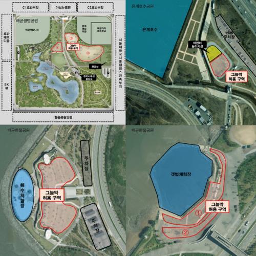 ¿î¿µ½Ã°£Àº ¿ÀÀü 9½ÃºÎÅÍ ¿ÀÈÄ 8½Ã±îÁöÀ̸ç, °¢ °ø¿ø ³» º°µµ ÁöÁ¤ ±¸¿ª¿¡¼ ÀÌ¿ëÇÒ ¼ö ÀÖ´Ù. ÇØ´ç ±¸¿ª¿¡¼´Â ½Ã¹Î ´©±¸³ª ¼ÒÇü¤ý°£ÆíÇü ±×´Ã¸·(¿øÅÍÄ¡ ÅÙÆ® µî)À» ¼³Ä¡ÇØ ÈÞ½Ä, µ¶¼, µµ½Ã¶ô ÀÌ¿ë µî °ÇÀüÇÑ ¿©°¡ Ȱµ¿ °ø°£À¸·Î Ȱ¿ëÇÒ ¼ö ÀÖ´Ù. ±×´Ã¸·Àº 1°¡Á·(4~5ÀÎ) ±âÁØÀÇ ¼ÒÇü(°¡·Î 3.0m, ¼¼·Î 2.5m À̳»)À¸·Î Á¦ÇѵȴÙ.